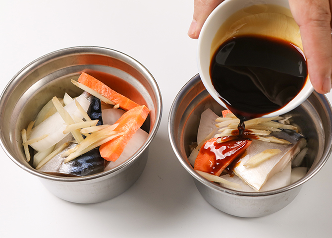 将鲭鱼切块,取一蒸碗并将鲭鱼甘露煮的相关食材放入,与蛋黄蒸肉一同放置蒸盘上,盖上锅盖,旋钮转到「蒸」功能,按下炊煮开关,直到开关跳起,保温灯亮即可。