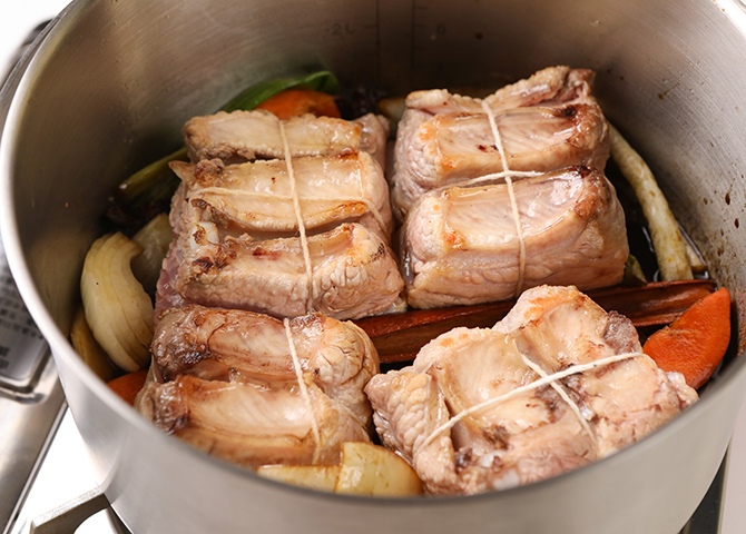 先將五花肉切四方,豬皮朝下於內鍋煎出豬油(直火加熱內鍋)。取出五花肉,並用繩子綁住備用。