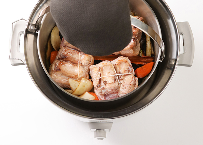 關閉直火,將綁好的五花肉與其他材料放置內鍋(請蓋上內鍋蓋),外鍋下1杯水,並把內鍋放回百年電鍋中。